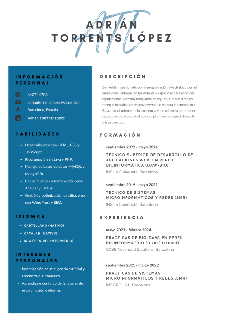 Soy Adrián Torrents López, un programador y desarrollador web apasionado por la tecnología. Con una sólida formación en desarrollo de aplicaciones y administración de sistemas, me dedico a crear soluciones digitales innovadoras, funcionales y personalizadas que simplifican procesos y generan valor. Me considero una persona curiosa, en constante aprendizaje y con el firme compromiso de superarme día a día.